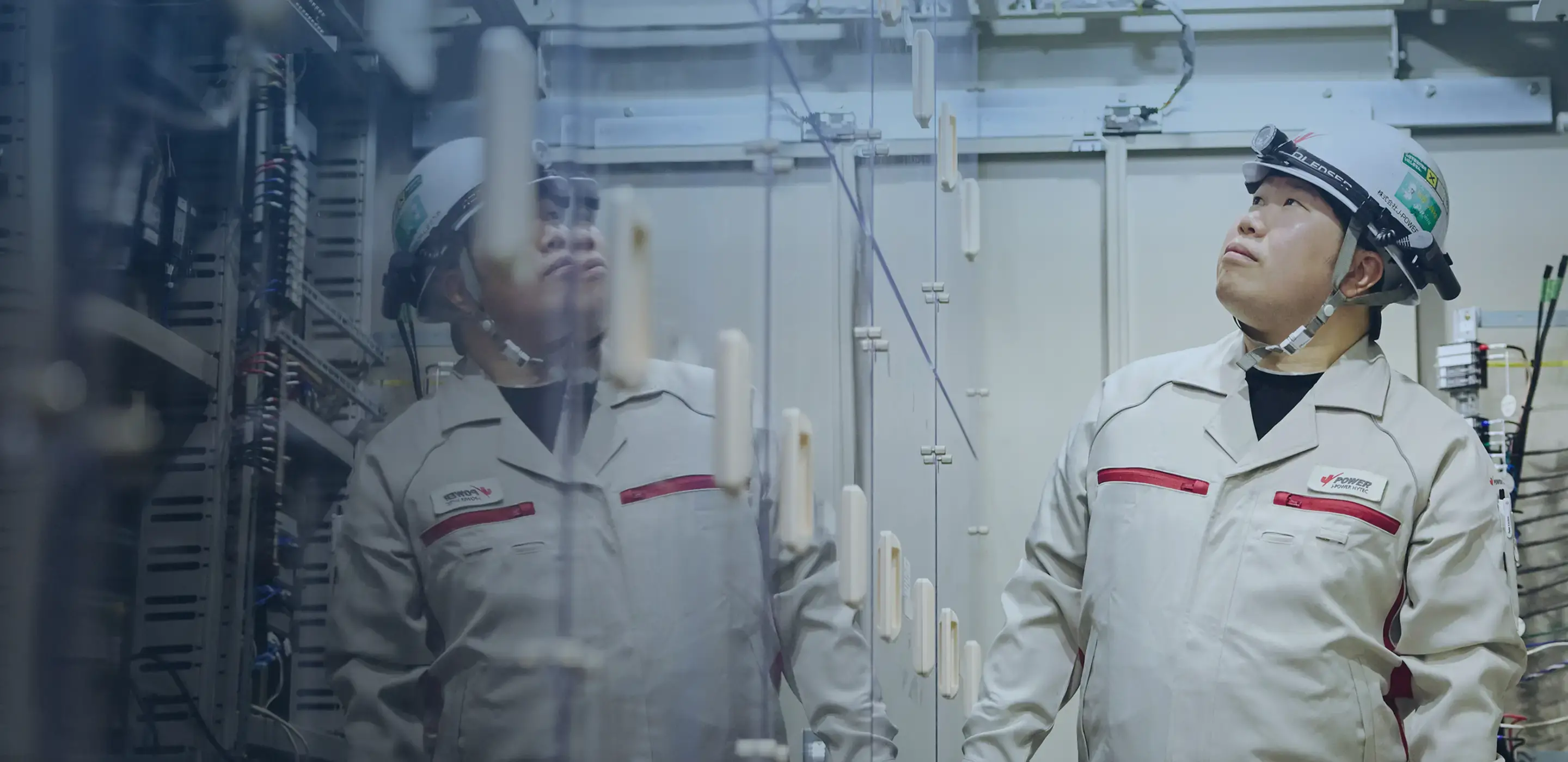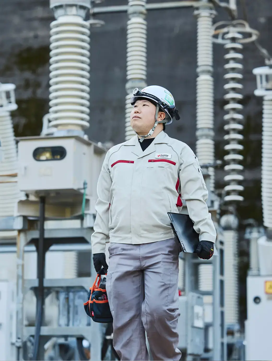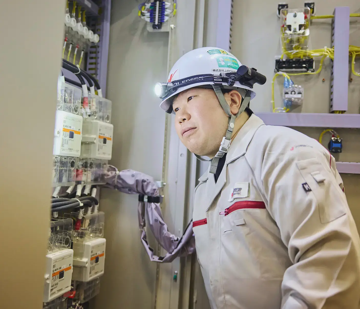 私が担当するのは、再生可能エネルギー施設である水力発電所の電気設備の点検・保守や施工管理です。発電機や変圧器、開閉設備、機器の状態を把握する監視装置など、発電所に設置されている全ての設備の状態を巡視点検等で五感を働かせて確認しています。異常を早期に発見・対応することで、安定した電力供給を支える重要な役割を担っています。
